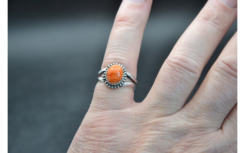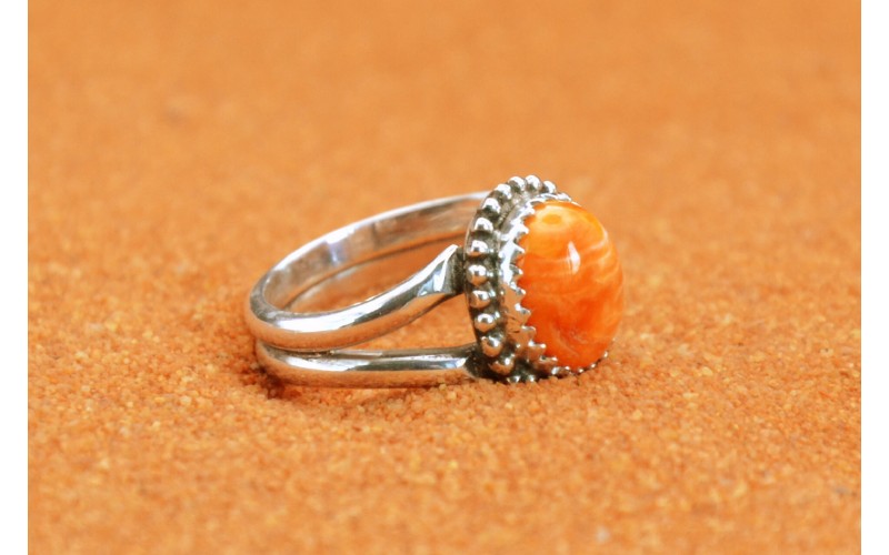Handcrafted sterling silver ring inlaid with spiny oyster, handmade by artisan the wolf.