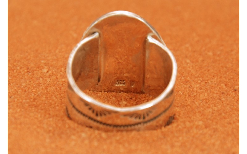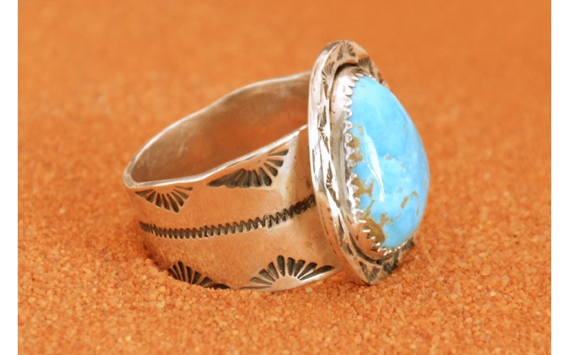 Handcrafted sterling silver ring set by a beautiful Sierra Blue turquoise stone, hammered with the sun symbol