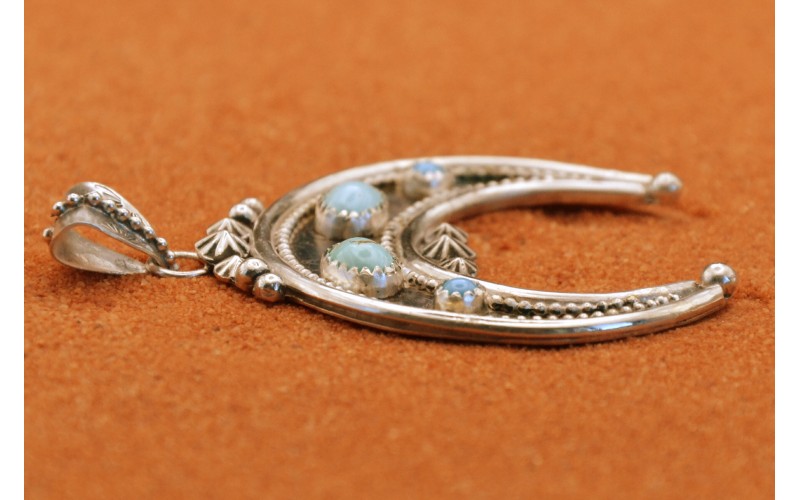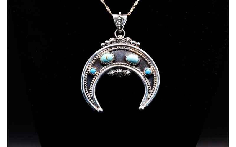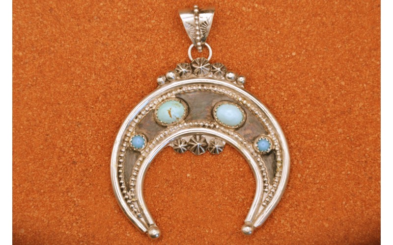 Handcrafted sterling silver Naja pendant set with two Royston turquoise stones and two small Kingman stones