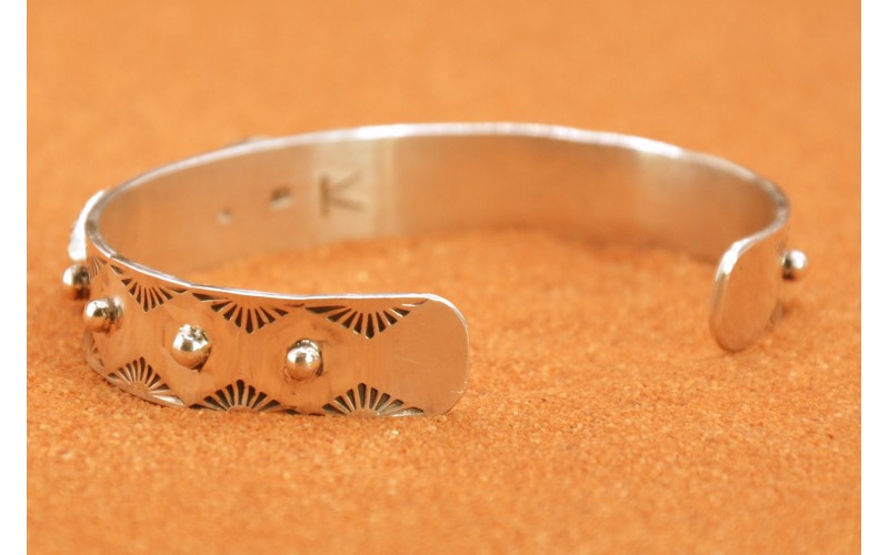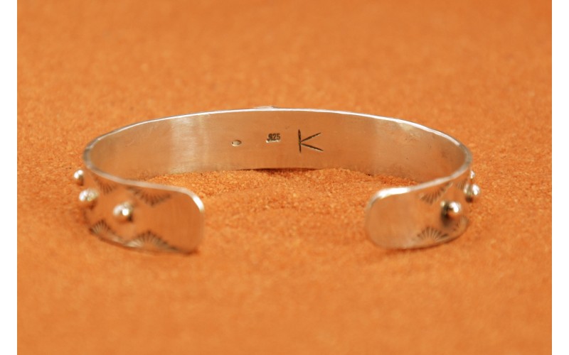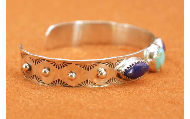 Handcrafted sterling silver bracelet set by a beautiful Sonoran turquoise stone and two lapis, hammerd by the sun symbol