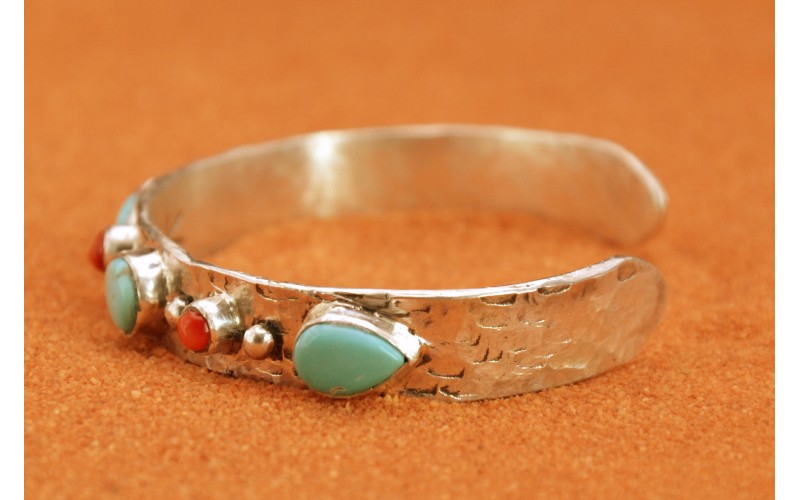 Handcrafted sterling silver bracelet set by four beautiful Kingman turquoise stones and coral
