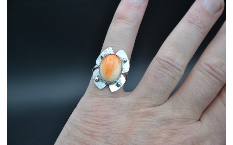 Handcrafted sterling silver ring in a flower shape set by a beautiful spiny oyster