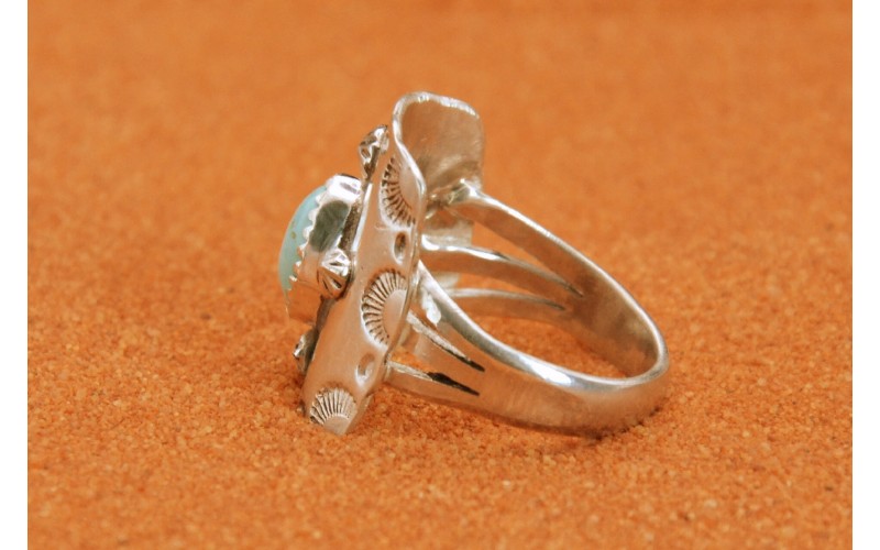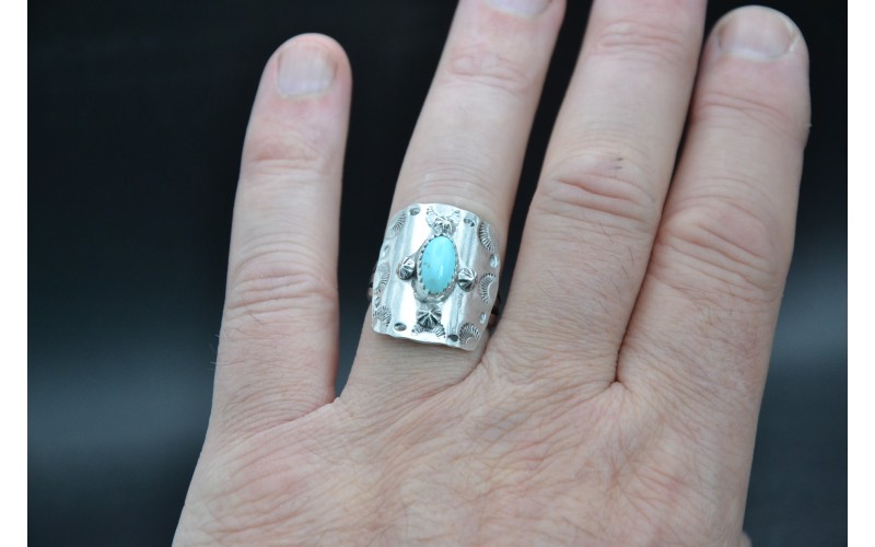 Handcrafted sterling silver ring set by a beautiful kingman turquoise stone, hammered by the sun symbol