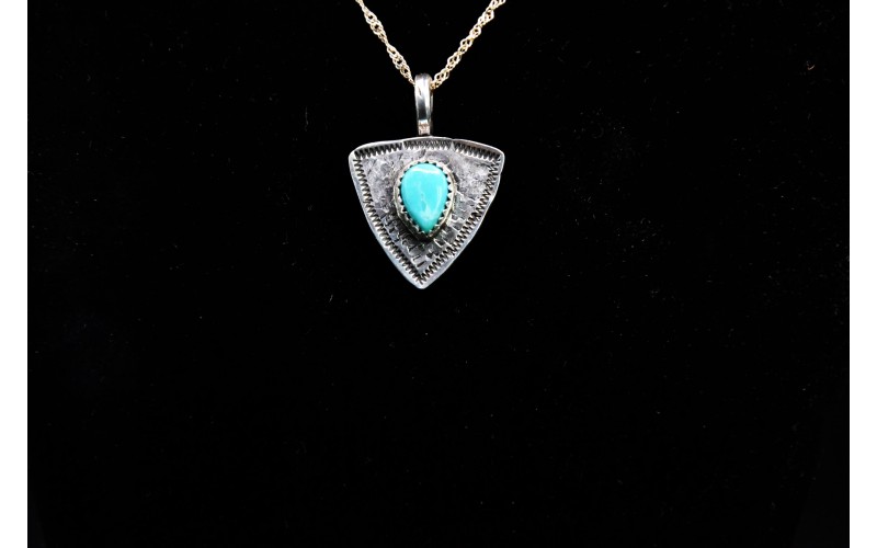 Handcrafted sterling silver pendant in an arrowhead shape set by a beautiful Kingman turquoise stone