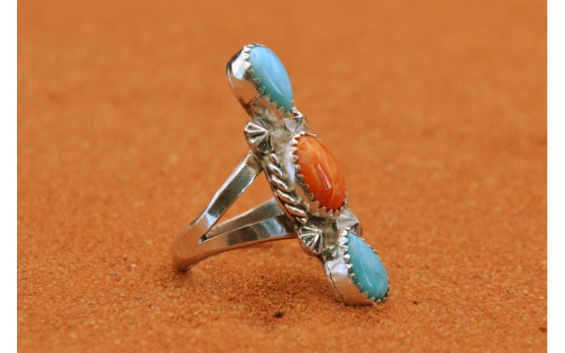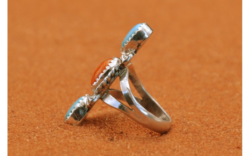 Handcrafted sterling siver ring set by two turquoise stones and spiny oyster
