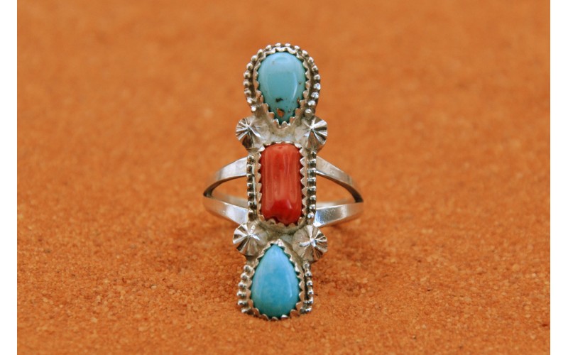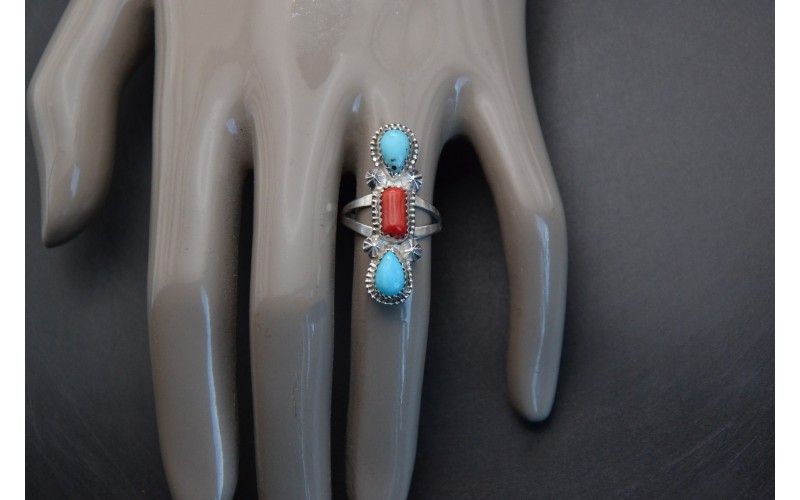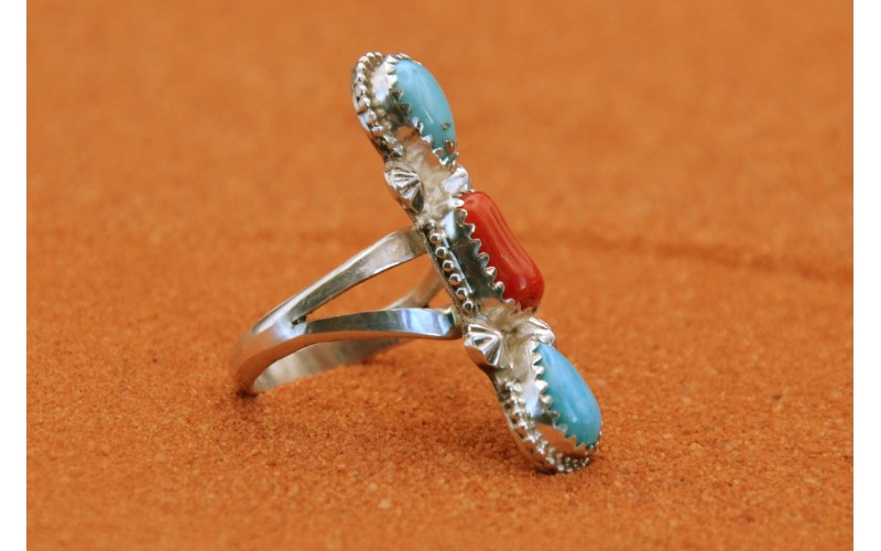 Handcrafted sterling silver ring set by two turquoise stones and coral