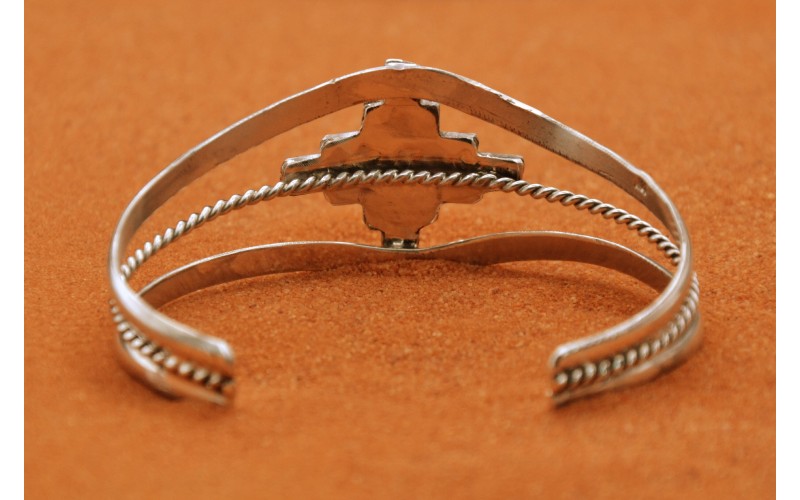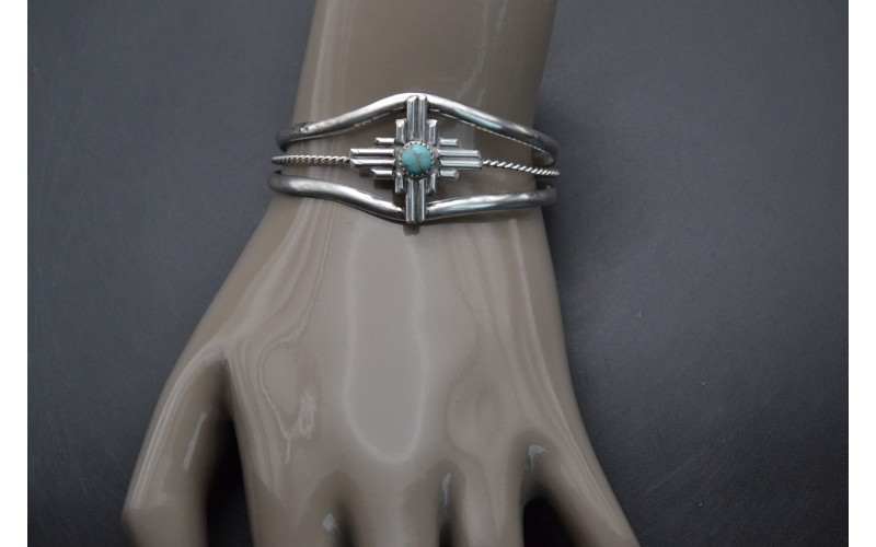 Handcrafted sterling silver Zia cross bracelet set by a beautiful Kingman turquoise stone