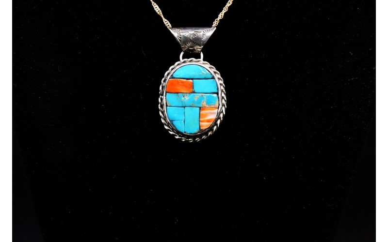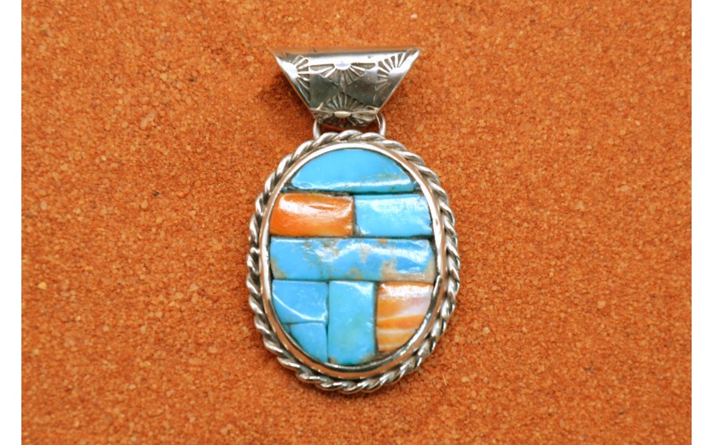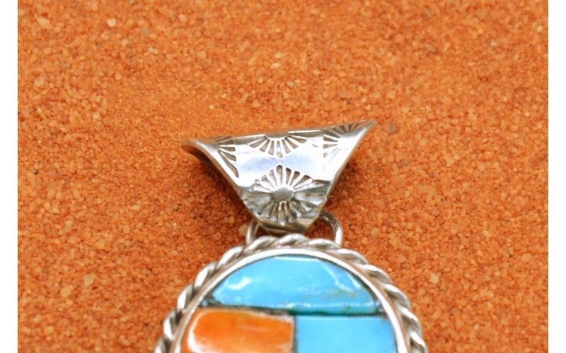 Handcrafted sterling silver pendant inlaid by Kingman turquoise stones and spiny oyster, the bail is hammered by the sun symbol