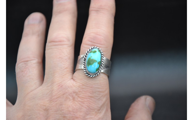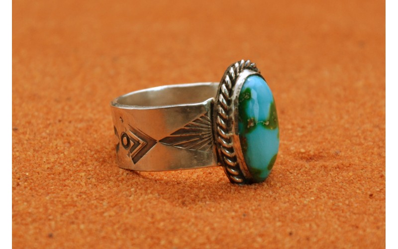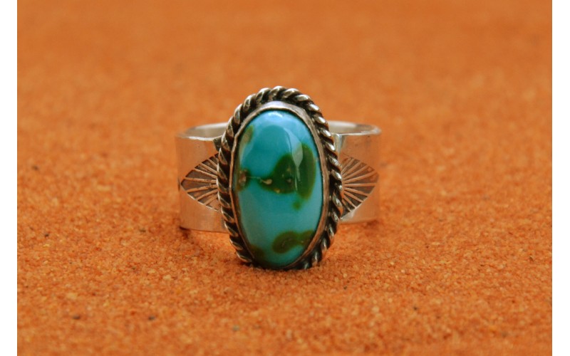 Handmade sterling silver ring set by a beautiful Sonoran Gold turquoise stone hammered by the sun symbol