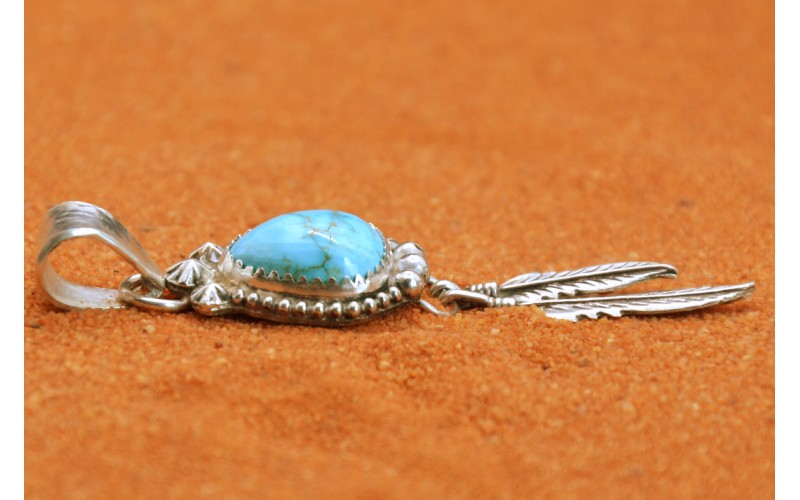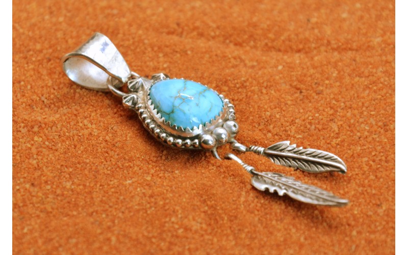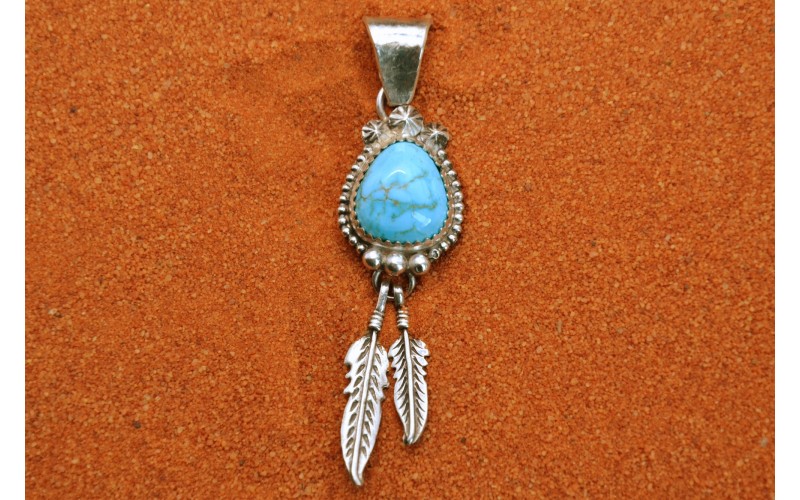 Handcrafted sterling silver pendant set by a beautiful Sonoran turquoise stone adorned with two feathers