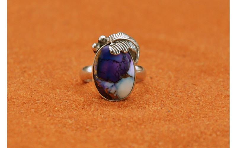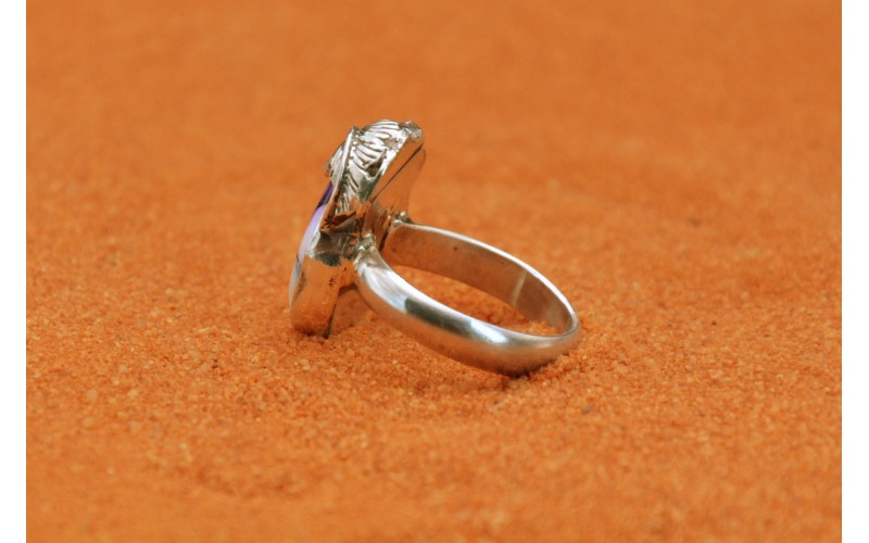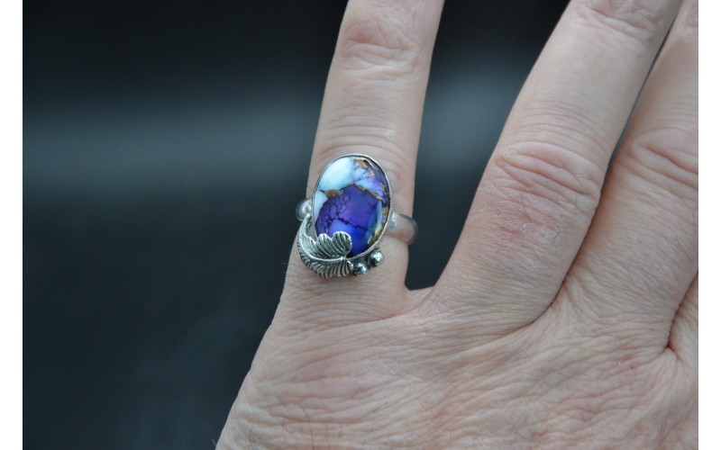 Handcrafted sterling silver ring set by a beautiful violet dahlia stone adorned by a leaf