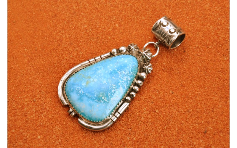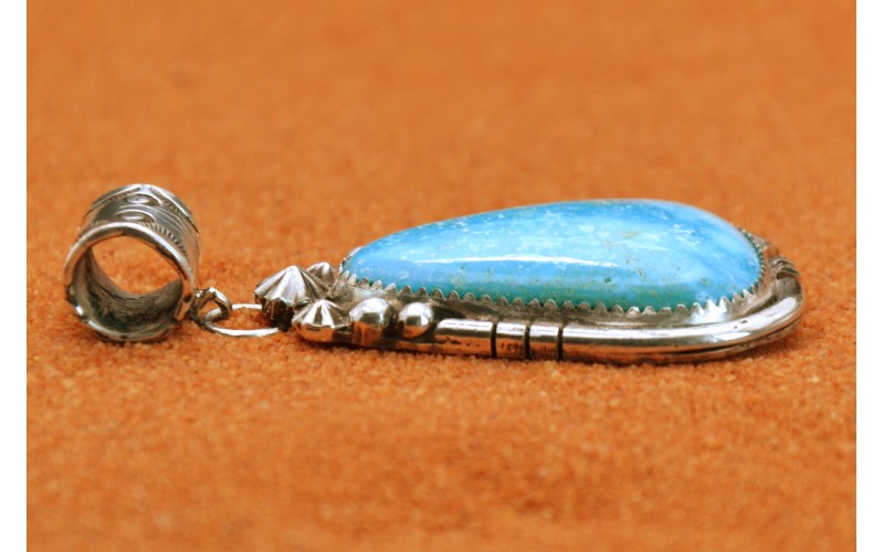 Handcrafted sterling silver pendant inlaid with a beautiful sonoran blue jay turquoise stone with a bail hammered by the sun symbol