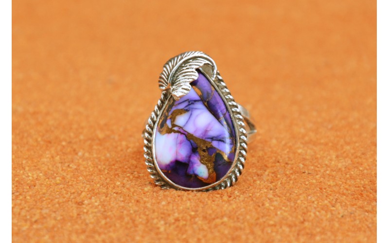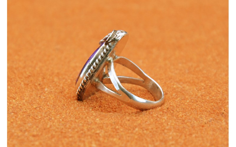 Handcrafted sterling silve rring set by a beautiful Violet Dahlia stone adorned by a leaf on the top