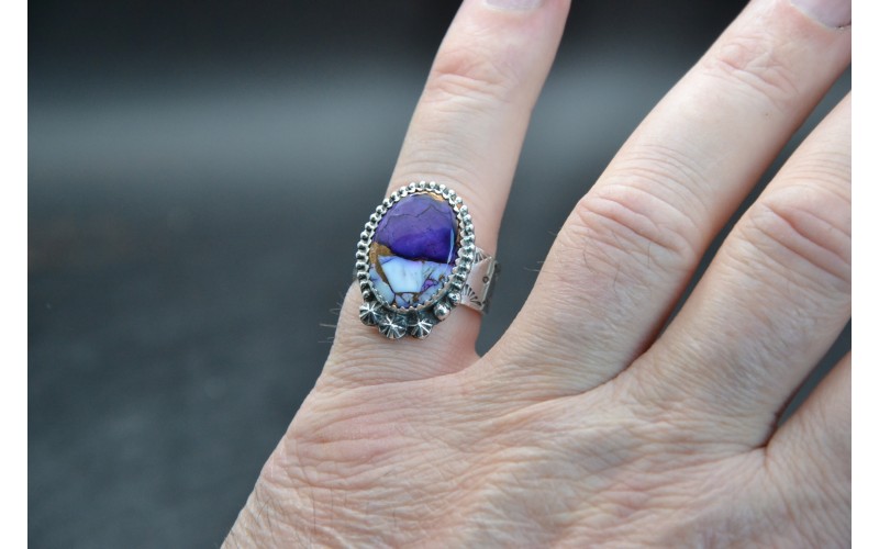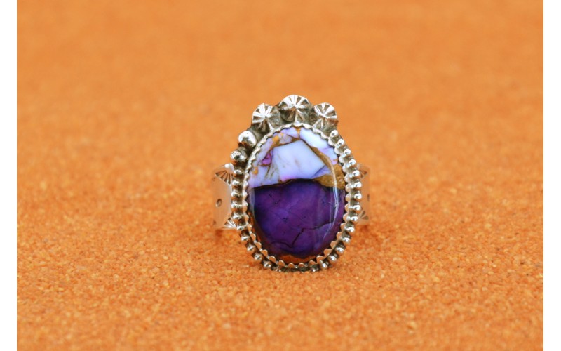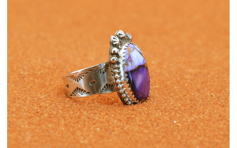 handcrafted sterling silver ring set by a beautiful Violet Dahlia and with the ring hammered by the sun symbol