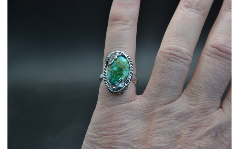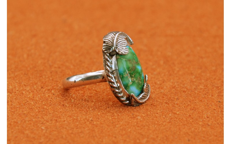 Handcrafted sterling silver ring set by a sonoran gold turquoise stone adorned by two leaves