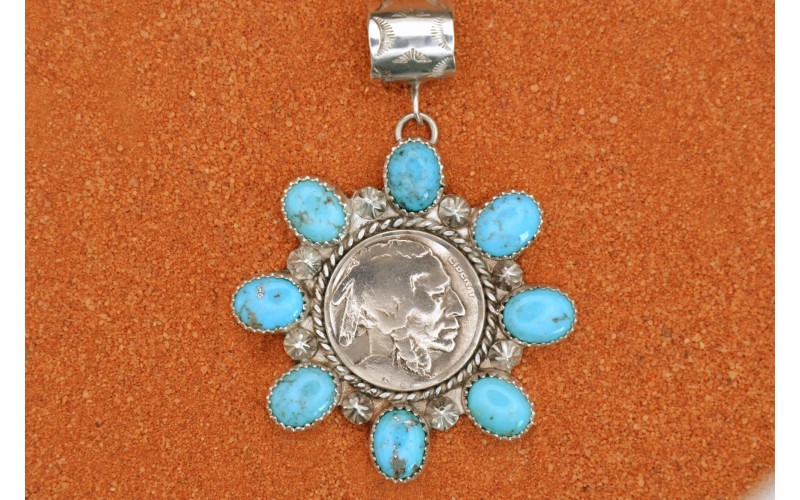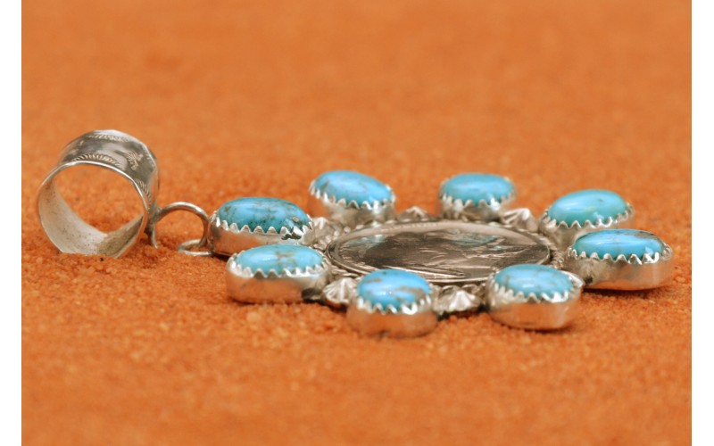 Handcrafted sterling silver pendant set by 8 kingman turquoise stones and adorned by the 5 cents indian head with a bail hammered by the sun symbol