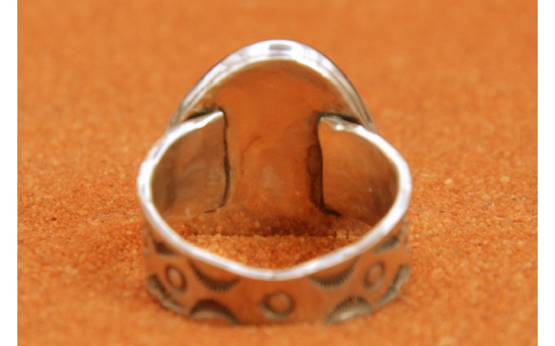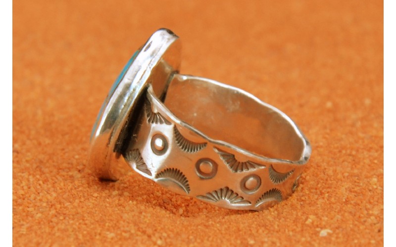 Handcrafted sterling silver ring set by a beautiful turquoise mountain stone hammered by the sun symbol