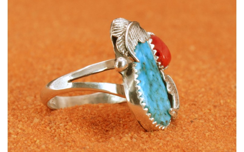 Handcrafted sterling silver ring set by a beautiful kingman turquoise stone and coral and adorned by two leaves