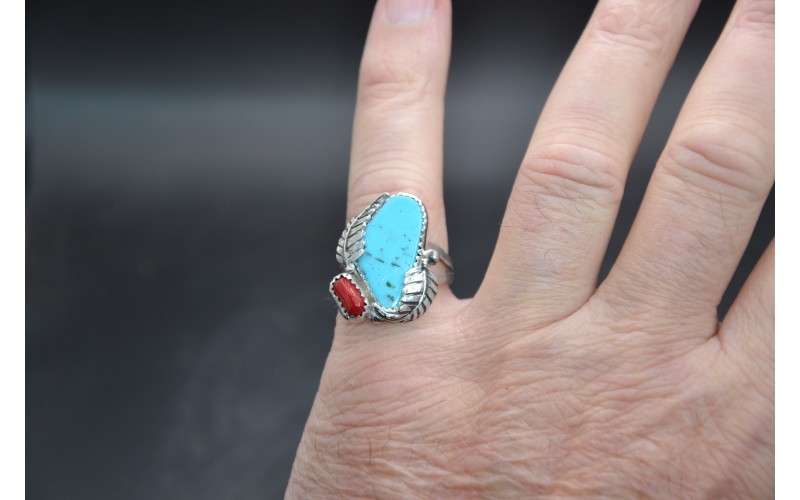 Handcrafted sterling silver ring set by a beautiful kingman turquoise stone and coral and adorned by two leaves