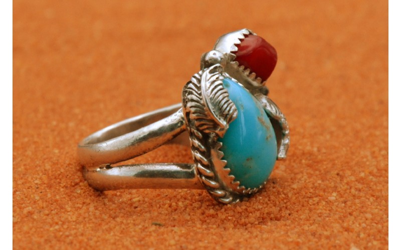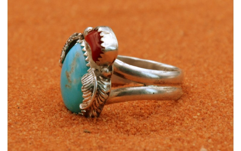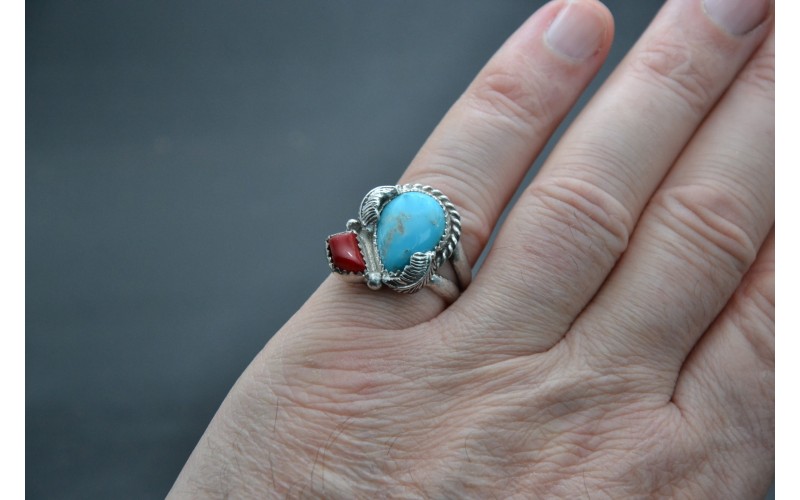 Handcrafted sterling silver ring set by a kingman turquoise stone and coral and adorned with two leaves