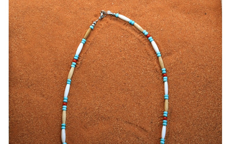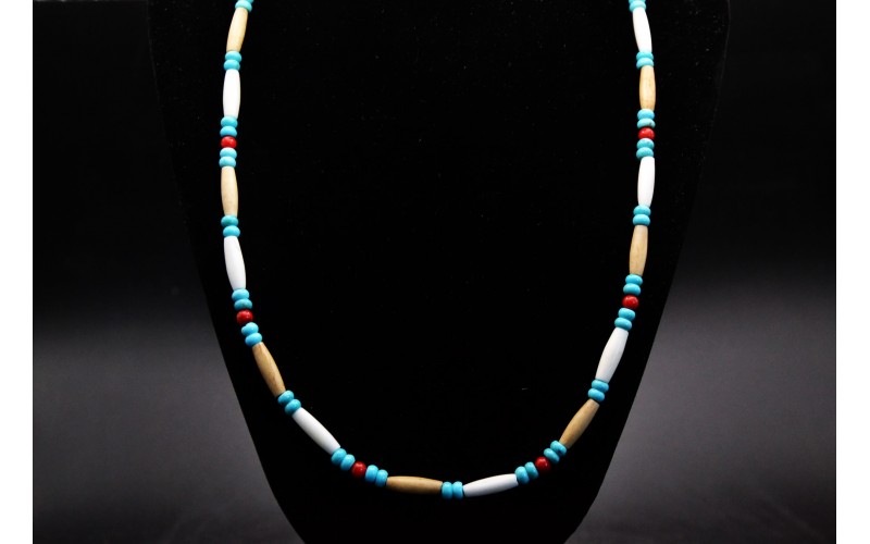 Handcrafted necklace with turquoise and coral beads and bone tubes