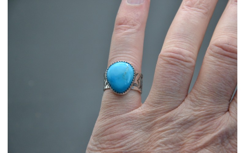 Handcrafted sterling silver ring set by a beautiful kingman turquoise stone and hammered by the sun symbol