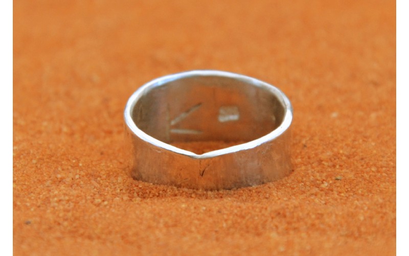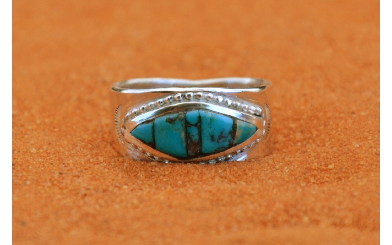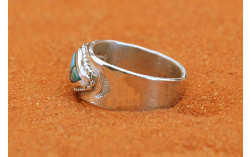 Handcrafted sterling silver ring inlaid with kingman turquoise stones and hammered by the sun symbol