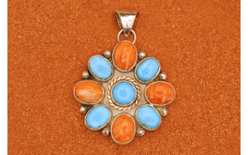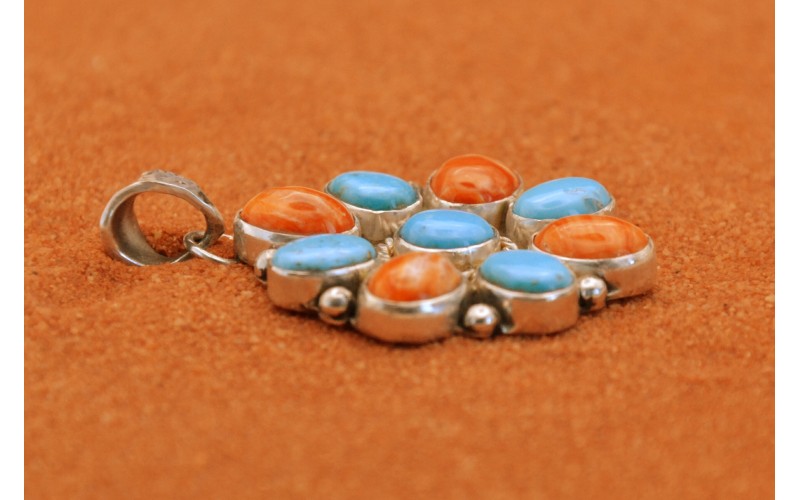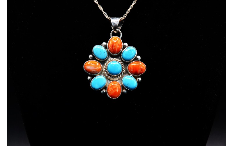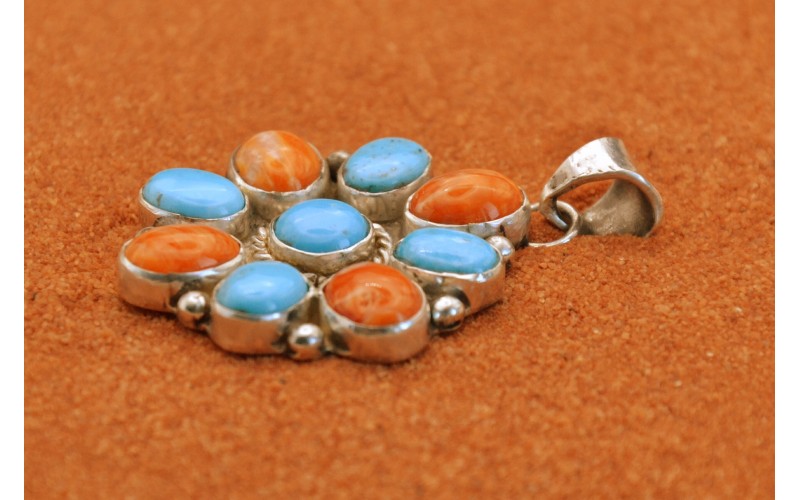 Pendentif fleur artisanal en argent 925/1000 incrusté de turquoises Kingman et de spiny oyster