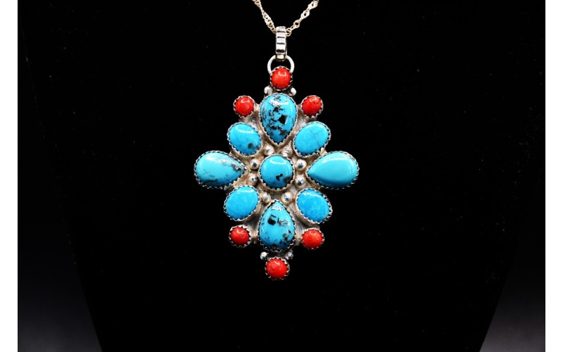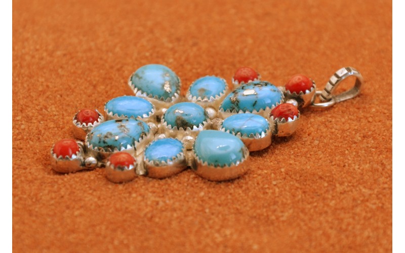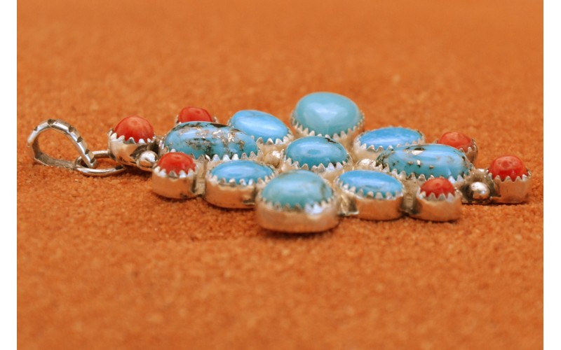 Pendentif artisanal en argent 925/1000 en forme de fleur serti de turquoises Kingman et de corail