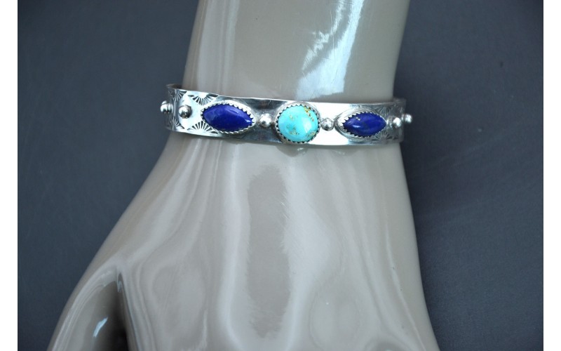 Bracelet artisanal en argent 925/1000 serti d'une magnifique turquoise Sonora et de deux lapis, frappé du symbole du soleil