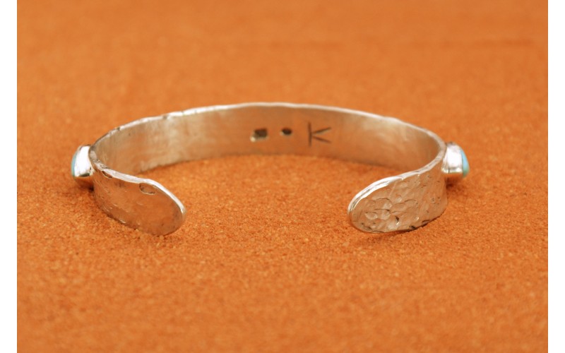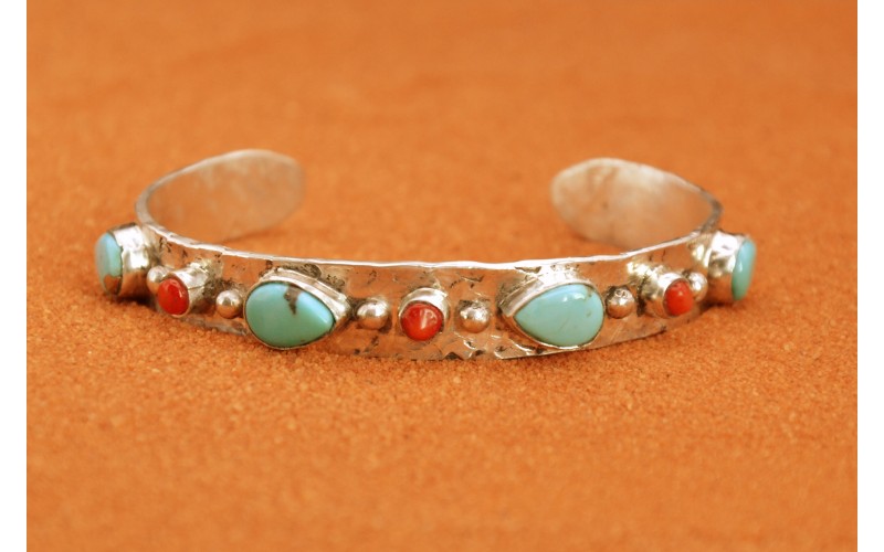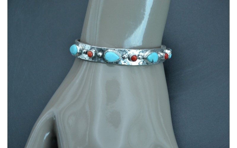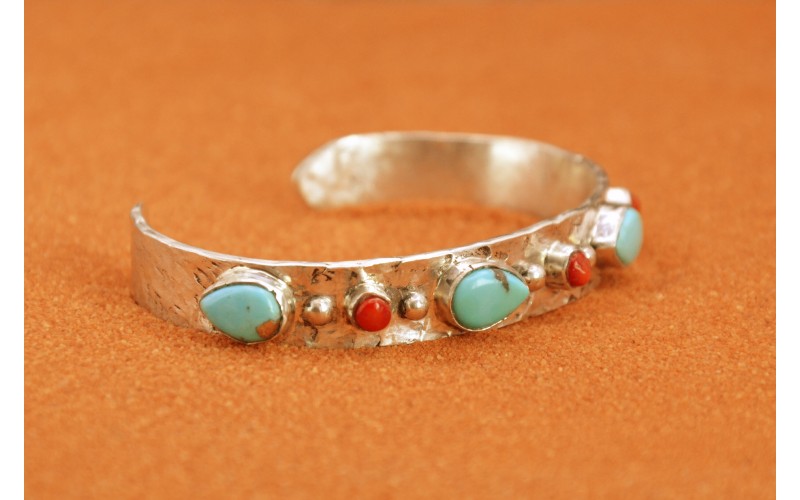 Bracelet artisanal en argent 925/1000 serti de quatre magnifiques turquoises Kingman et de corail