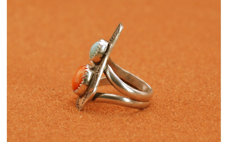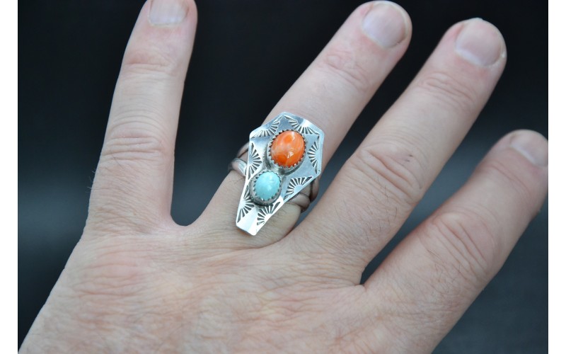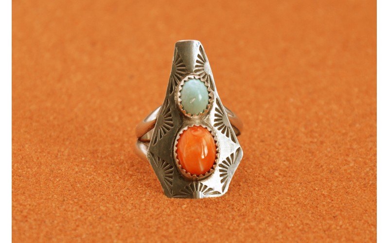 Bague artisanale en argent 925/1000 en forme de tête de lance sertie d'une belle turquoise Kingman et de spiny oyster, frappée du symbole du soleil
