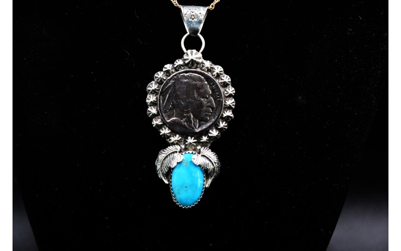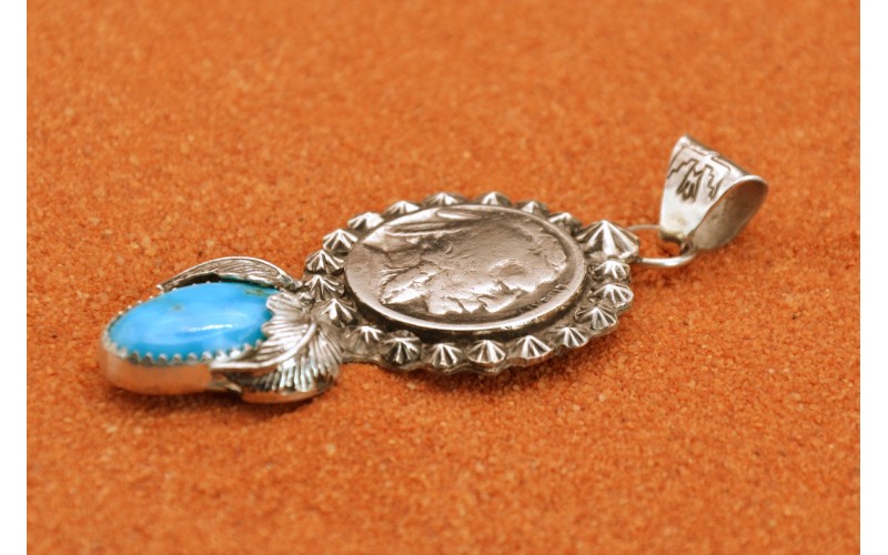 Pendentif artisanal en argent 925/1000 avec une tête d'indien et une magnifique turquoise Kingman, la bélière est frappée de l'oiseau tonnerre.