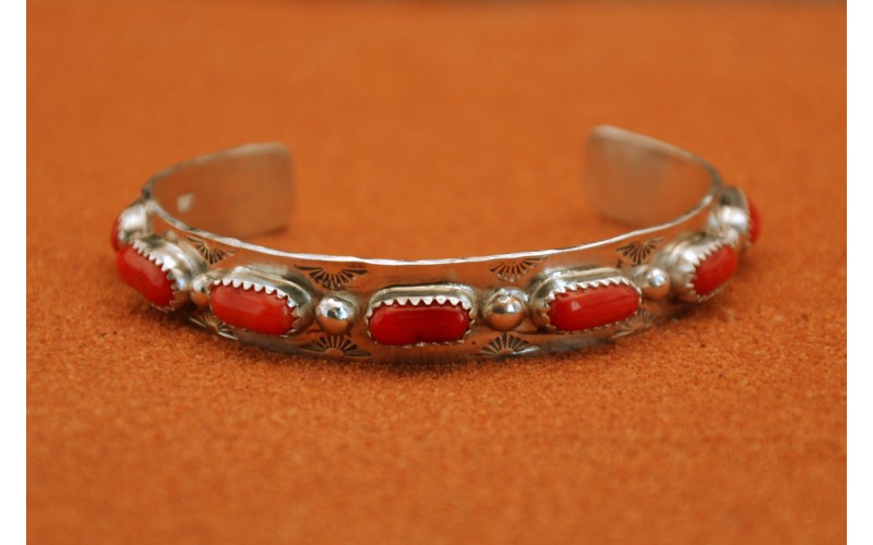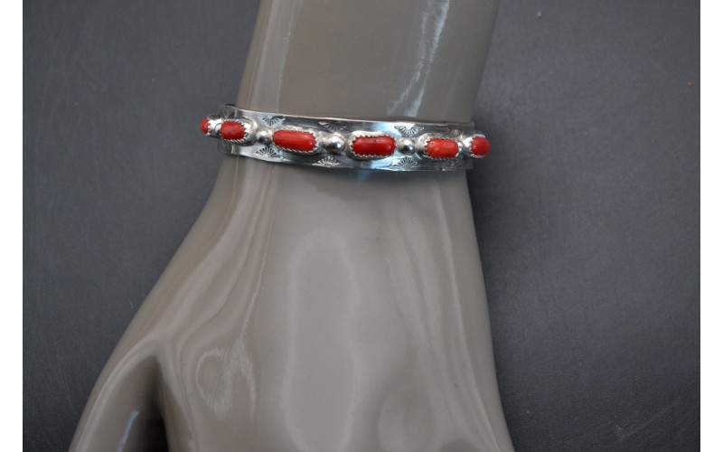 Bracelet artisanal en argent 925/1000 serti de corail et frappé du symbole du soleil