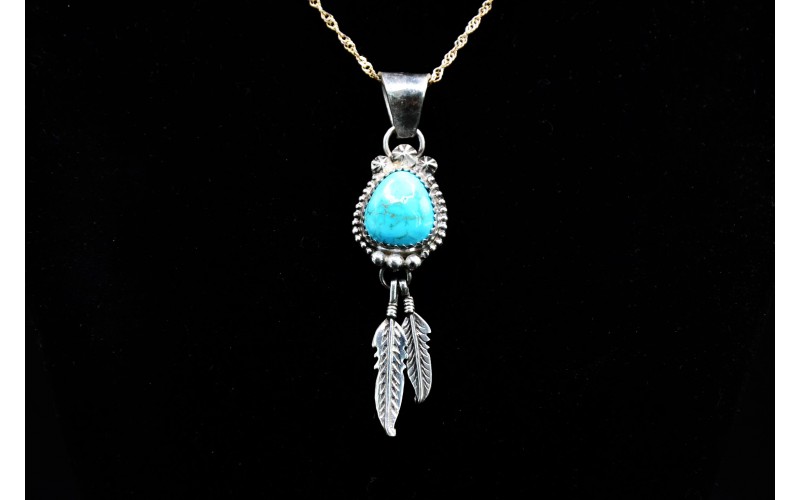 Pendentif artisanal en argent 925/1000 serti d'une magnifique turquoise Sonora orné de deux plumes sur le bas