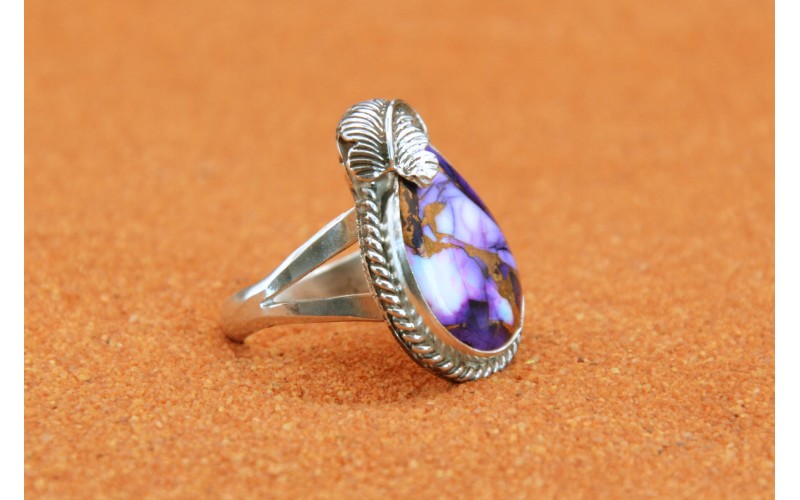 Bague artisanale en argent 925/1000 sertie d'une magnifique Violet Dahlia ornée d'une feuille sur le haut