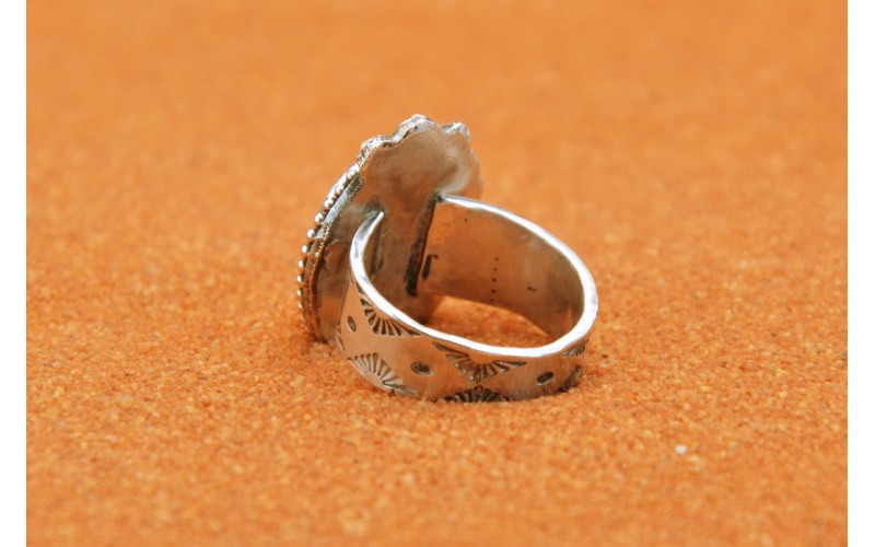 Bague artisanale en argent 925/1000 sertie d'une magnifique Violet Dahlia avec un anneau frappé du symbole du soleil