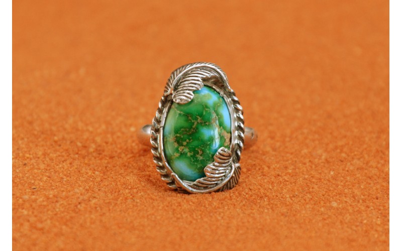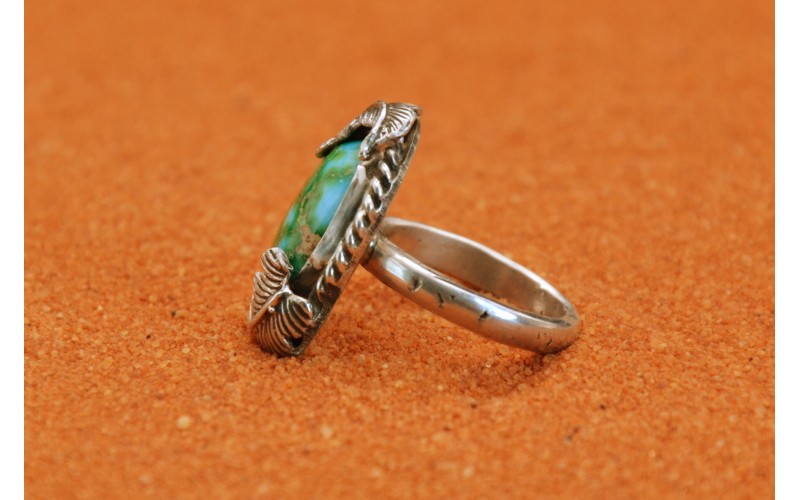 Bague artisanale en argent 925/1000 sertie d'une magnifique turquosie sonora gold ornée de deux feuilles