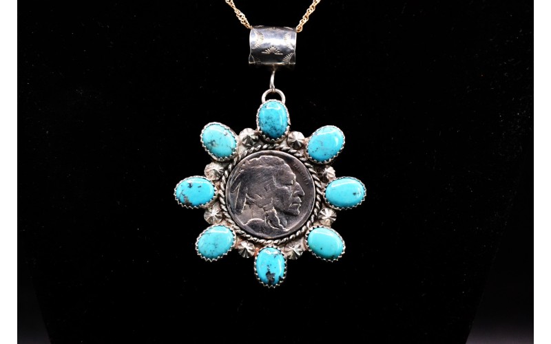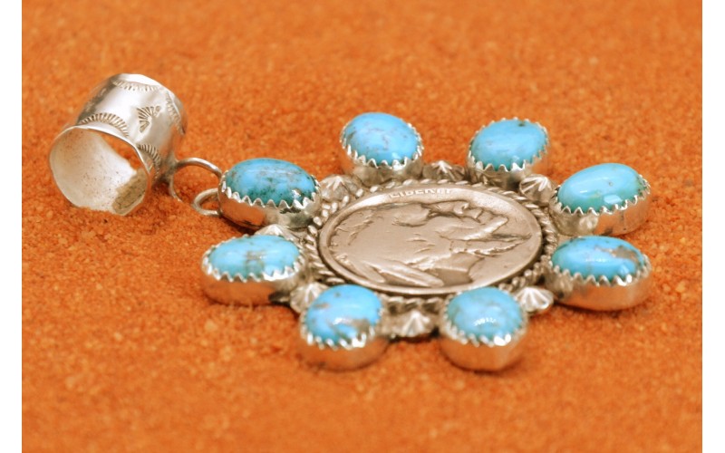 Pendentif artisanal en argent 925/1000 serti de 8 turquoises kingman orné d'une pièce de 5 cents avec la tête d'indien au centre avec une bélière frappée du symbole du soleil.