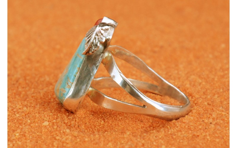 Bague artisanale en argent 925/1000 sertie d'une magnifique turquoise kingman et de corail et ornée de deux feuilles.