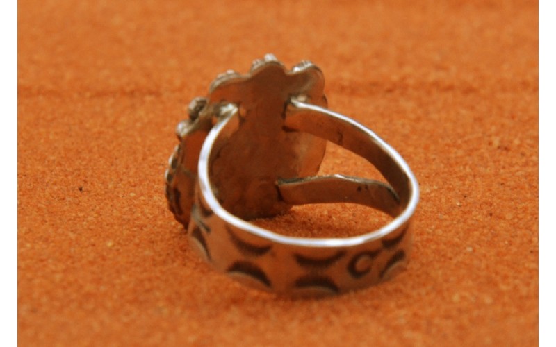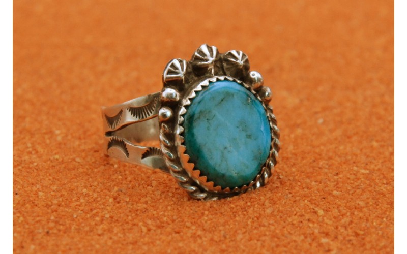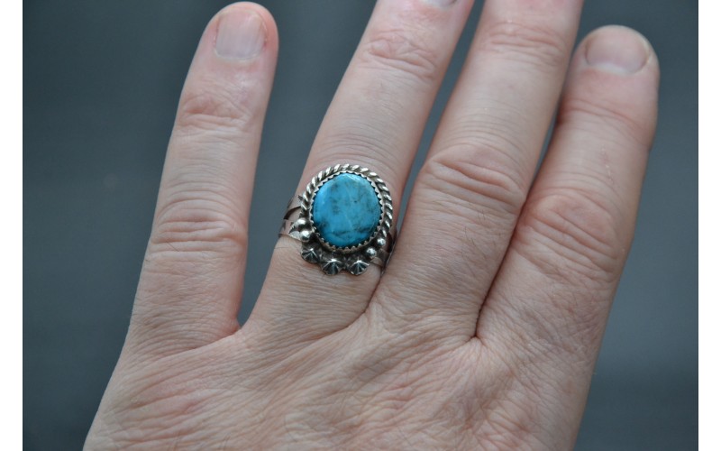 Bague artisanale en argent 925/1000 sertie d'une magnifique turquoise kingman frappée du symbole du soleil sur l'anneau