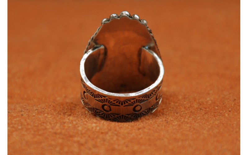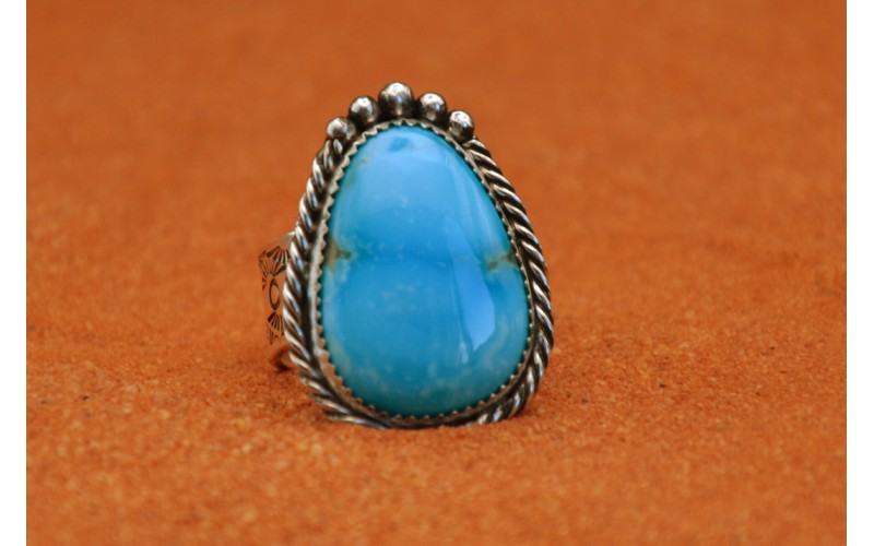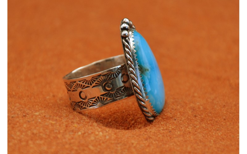 Bague artisanale en argent 925/1000 sertie d'une magnifique turquoise kingman avec un anneau frappé du symbole du soleil