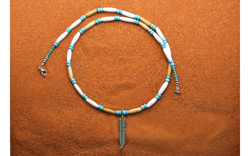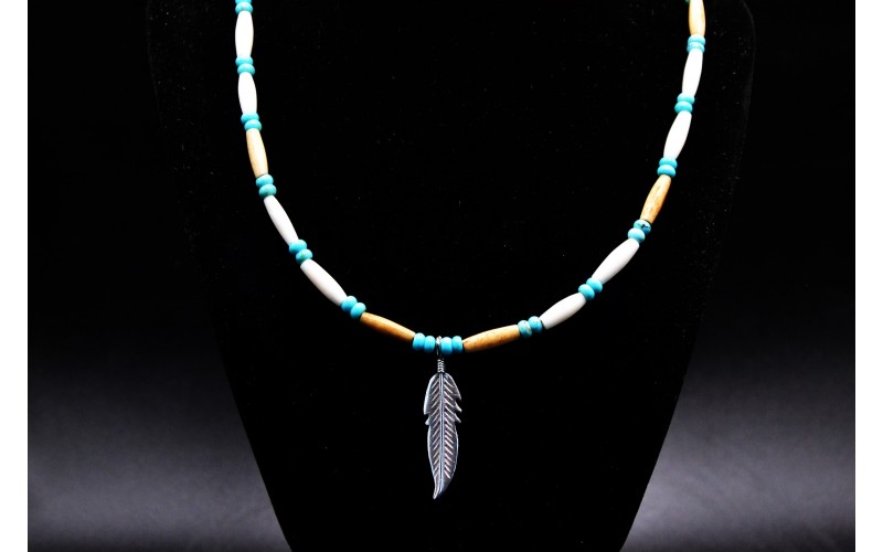 Collier artisanal avec une plume en pendant des tubes en os et des perles en turquoise kingman