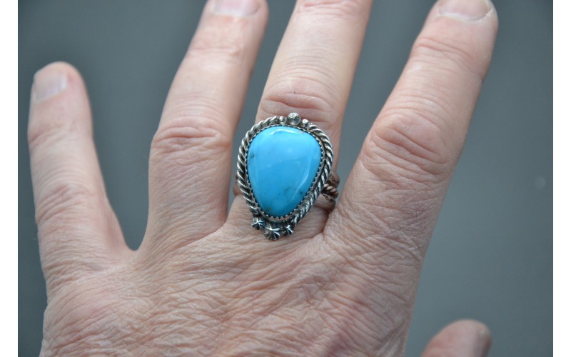 Bague artisanale en argent 925/1000 sertie d'une magnifique turquoise kingman avec un anneau frappé du symbole du soleil