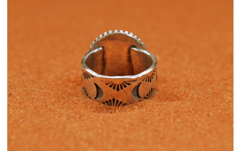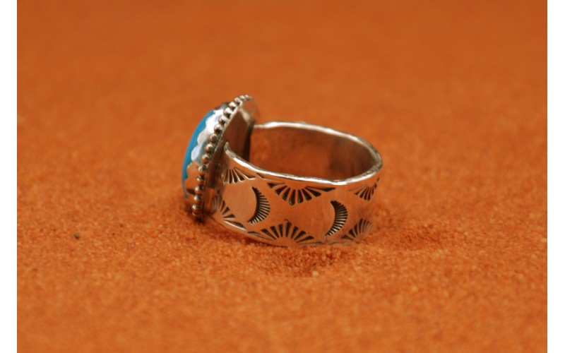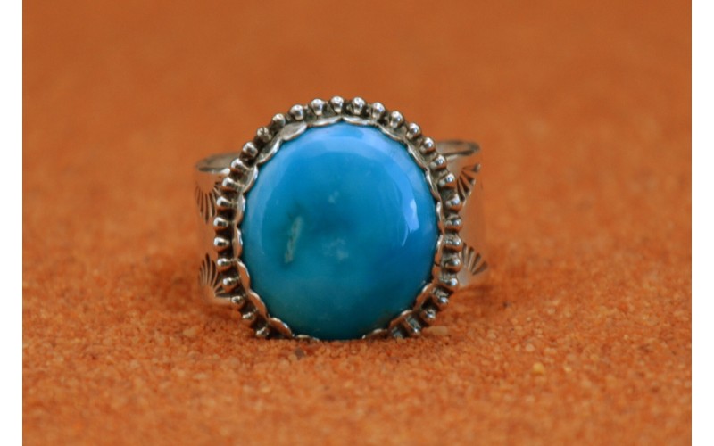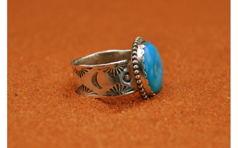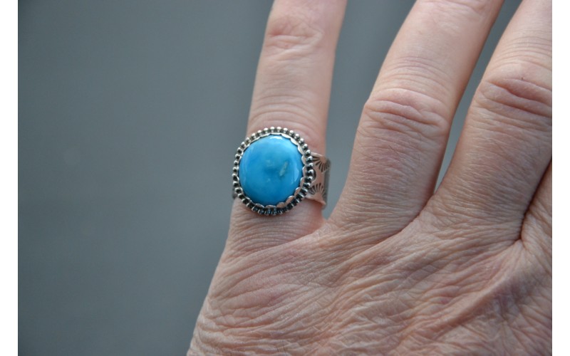 Bague artisanale en argent 925/1000 sertie d'une magnifique turquoise kingman avec un anneau frappé du symbole du soleil