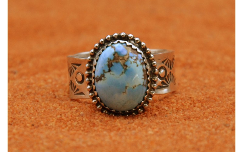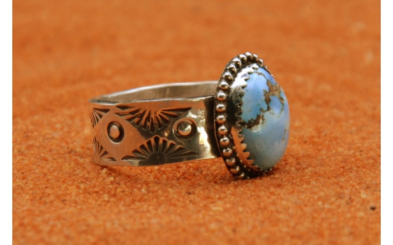 Bague artisanale en argent 925/1000 sertie d'une magnifique turquoise golden hill avec un anneau frappé du symbole du soleil