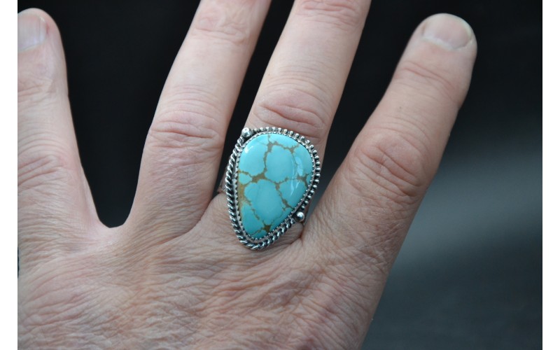 Bague artisanale en argent 925/1000 sertie d'une magnifique turquoise number 8 avec un anneau frappé du symbole du soleil