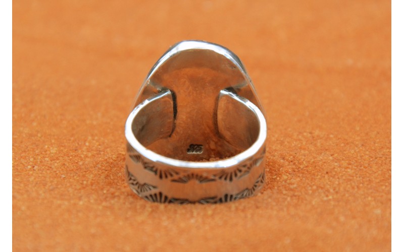 Bague artisanale en argent 925/1000 sertie d'une magnifique turquoise persane avec un anneau frappé du symbole du soleil