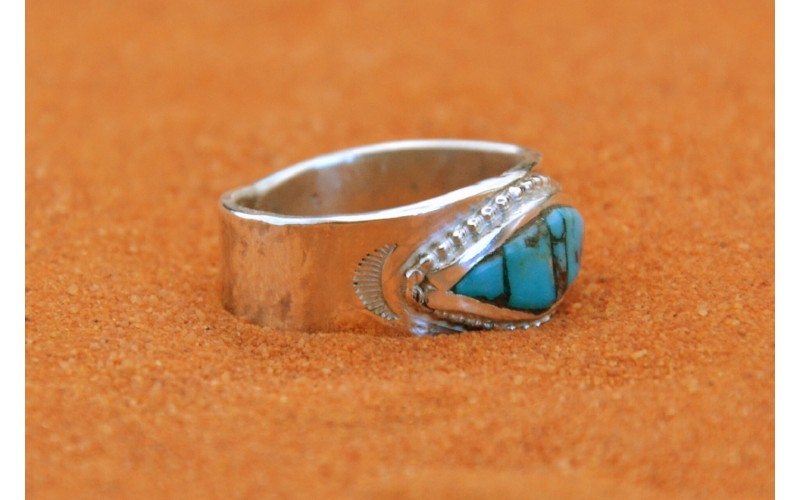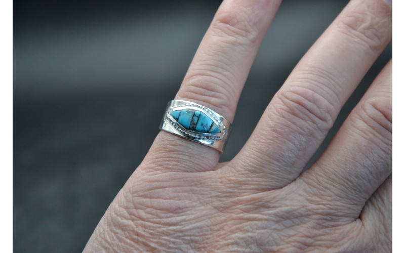 Bague artisanale en argent 925/1000 incrustée de turquoise kingman et frappée du symbole du soleil